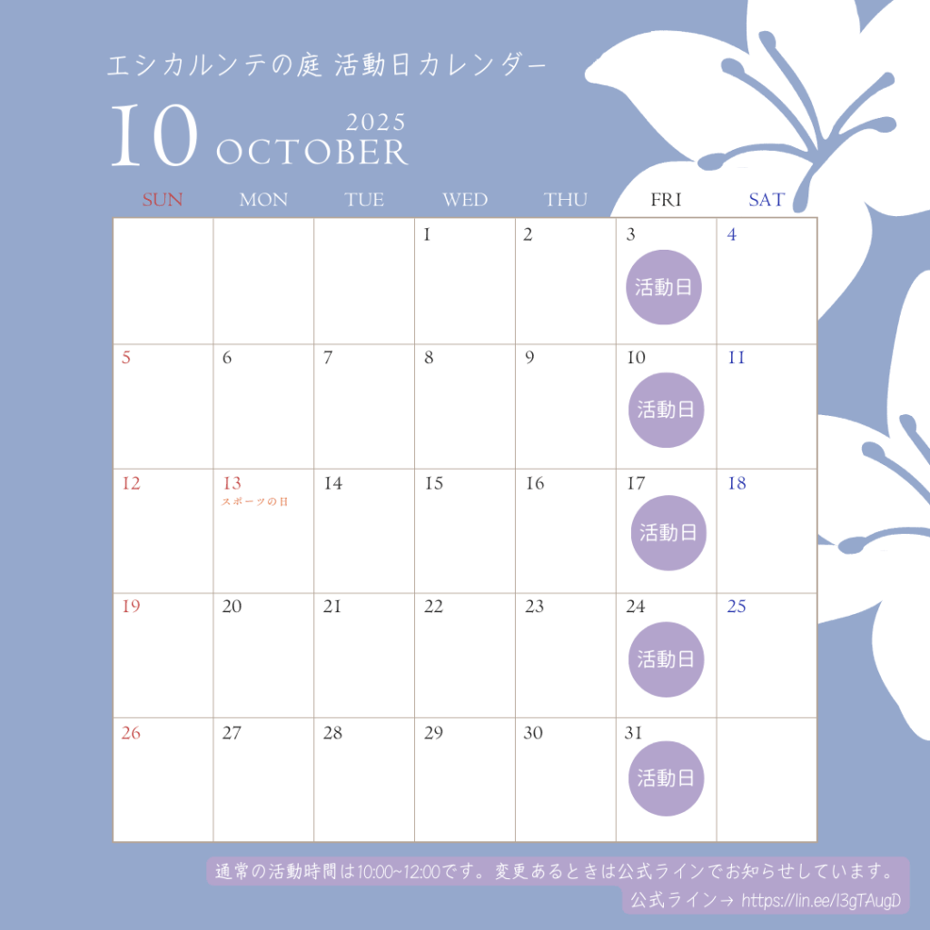 2025年10月 エシカルンテの庭 活動スケジュールカレンダー